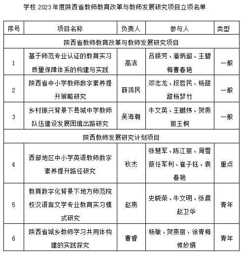 近日,陕西省教育厅公布了2023年度陕西省教师教育改革与教师发展研究项目立项名单,我校6个项目获批立项,其中重点项目1项,一般项目3项,青年项目2项。
