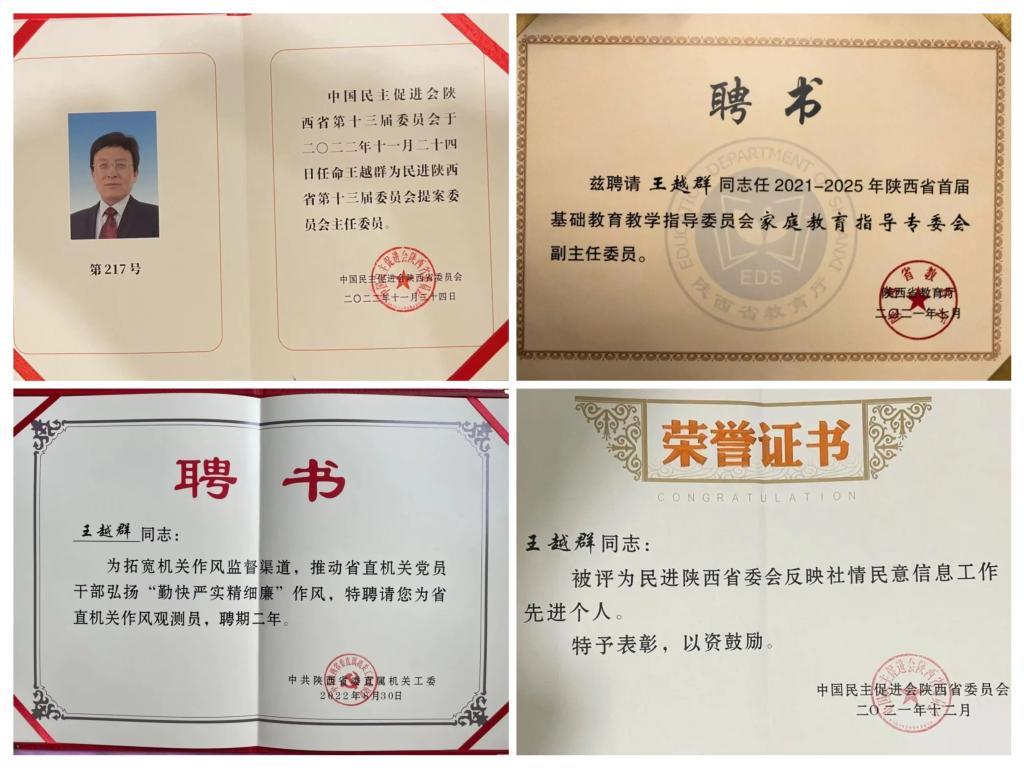 出版参政议政著作《参与者的力量》一书及《越群说教育》专著,接受央视新闻调查栏目专访、《刘志丹的统战故事》获得建党100周年西安市委统战部论文征集一等奖第一名;