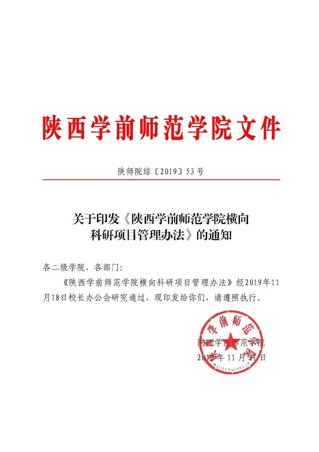 努力构建与国家、陕西省科研管理制度改革和学校发展目标相适应的科研管理制度体系。修订完善和出台了《陕西学前师范学院横向科研项目管理办法》《陕西学前师范学院科技成果转移转化办法》《陕西学前师范学院青年教师科研创新能力提升计划》《陕西学前师范学院学术交流活动管理办法》《陕西学前师范学院专利管理办法》《陕西学前师范学院纵向科研经费管理办法》《陕西学前师范学院科研诚信建设与管理办法(试行)》《陕西学前师范学院科研业绩认定办法(试行)》等10余项管理制度。通过改革管理模式,简政放权,深化落实放管服,建立起行之有效的科研管理体制,有效保证了科研工作持续合规有效的开展,充分调动了广大教职工开展科研工作的积极性,良好的科研氛围逐步形成。