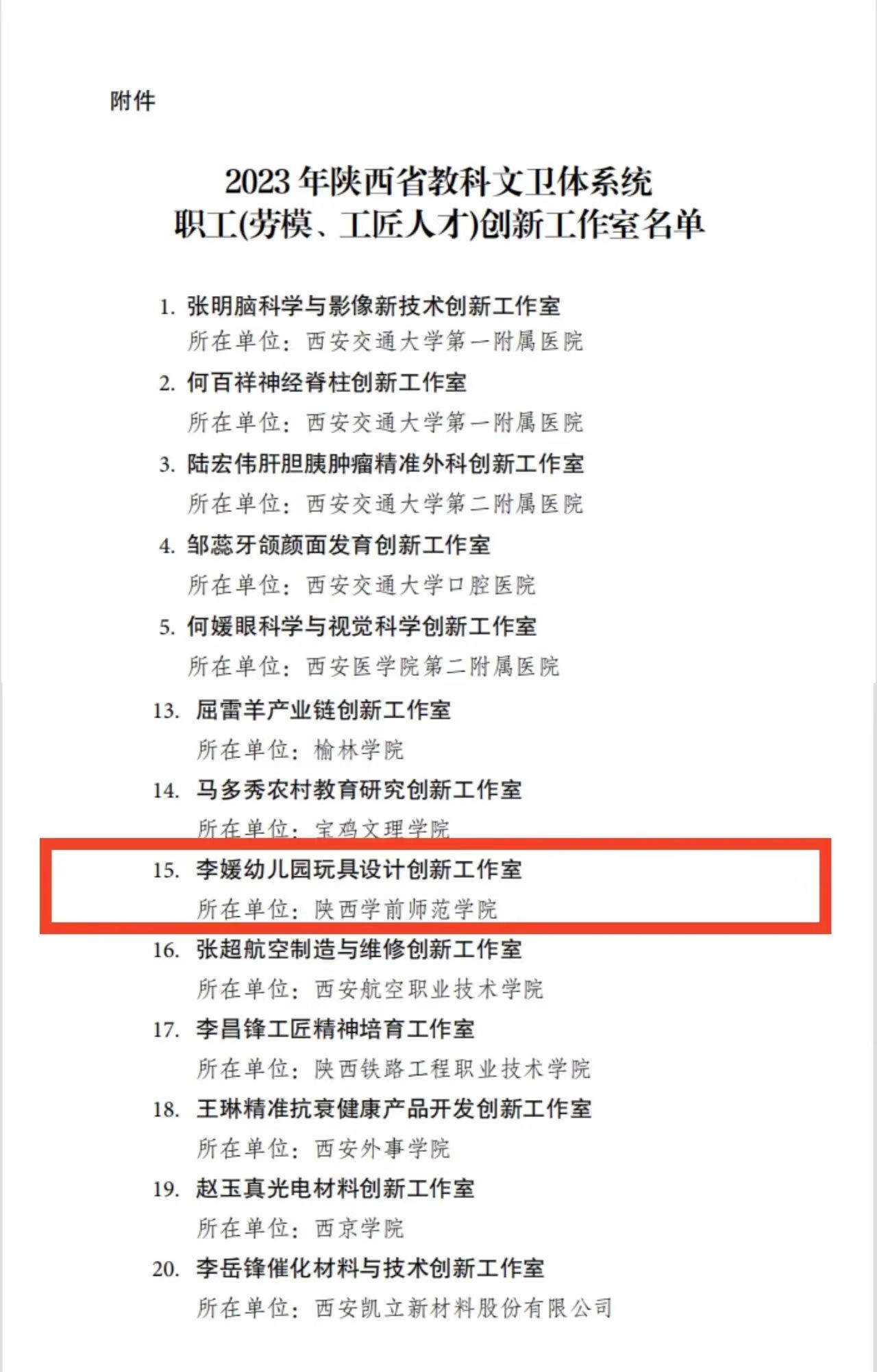 近日,陕西省教科文卫体工会委员会发布关于命名2023年陕西省教科文卫体系统职工(劳模、工匠人才)创新工作室的决定,由我校附属幼儿园李媛园长主持申报的李媛幼儿园玩具设计创新工作室获批通过。