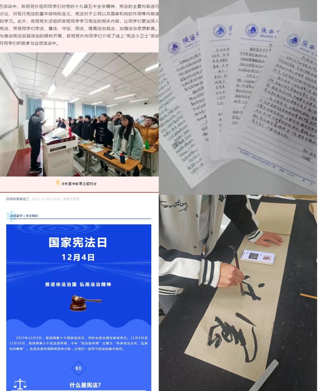 各二级学院结合本院实际,开展了形式多样的“宪法宣传周”主题教育活动,普及宪法知识。学唱《宪法伴我们成长》,召开主题教育班会活动,创作书法研习活动,书写学习心得等。