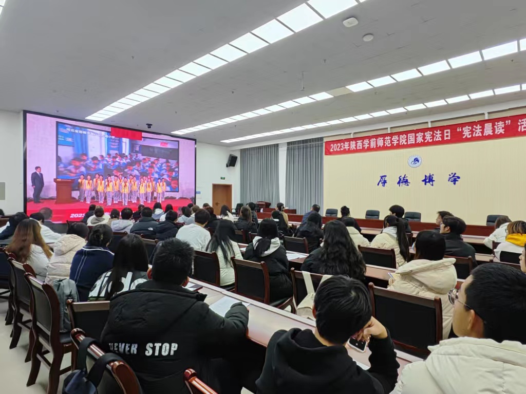 2023年12月4日上午,由教育部统一组织开展以“大力弘扬宪法精神,建设社会主义法治文化”为主题的“宪法晨读”活动。我校学工部副部长王成富,教育管理科工作人员以及各学院学生代表在图书馆三楼报告厅通过普法网直播,参与了教育部开展的教育系统“宪法晨读”活动,共读《宪法》部分条款等。在场学生认真聆听教育部领导讲话,参会学生深刻体悟法治精神,感受宪法权威。