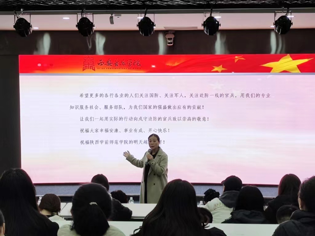 2023年12月6日下午3点,我校举办首期“传承红色文化 厚植爱国情怀”为主题的“一站式”学生社区沙龙活动。西安音乐学院教授、硕士研究生导师、陕西省思想政治工作重点研究基地专家——张津波教授受邀为我校百余名学生做了《艺术走边防——致敬边防官兵》的爱国主义教育报告。学工部部长薛晓娟,副部长王成富与教育管理科工作人员以及各二级学院百余名学生听取了本次讲座,讲座由学工部部长薛晓娟主持。