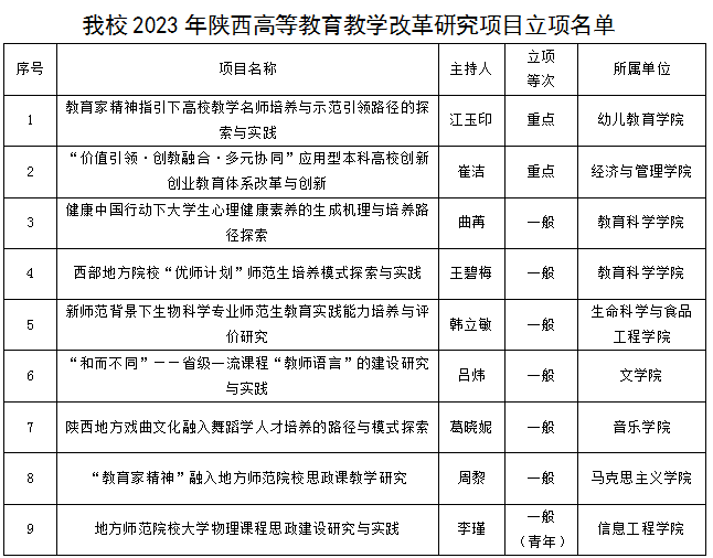 近日,陕西省教育厅公布了2023年度陕西本科和高等继续教育教学改革研究项目立项结果。我校限额申请11项,获批项目9项(重点2项,一般6项,青年1项),立项率81.8%。同时,学校以主要完成单位参与申报项目2项。获批项目数量、层次和立项率位居省属同类院校前列,再创历年新高。