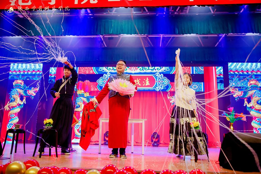 晚会格调高雅、气势恢宏、节目丰富、创意纷呈,婉转悠扬的演唱、翩跹灵动的舞蹈、声情并茂的朗诵、巧妙奇幻的魔术等多种艺术形式交相辉映,精彩不断,高潮迭起。民乐合奏《踏雪归集》以宏大的场面和欢快的节奏瞬间点燃全场观众的热情;情景剧《新年小手牵 师心伴童颜》生动诠释了我校办学特色的鲜活展现;原创舞蹈《秦塑》铭刻了秦风古韵,以舞蹈形式表现古朴深厚的三秦文化传承;魔术《古彩戏法》彰显了中华优秀传统文化的博大精深与永恒魅力;配乐诗朗诵《新年,你好》是师院全体师生对新年发出的美好期待与祝福;此外,还有活力四射的现代舞、舞台秀、古典舞、二重唱等节目轮番上演,充分展示了我校师生多才多艺的综合素质和积极向上的青春风采,场内场外、台上台下连成一片欢乐的海洋。
