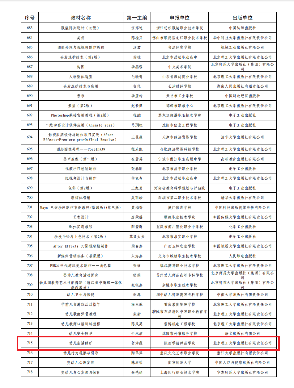 2026年1月26日,教育部发布《关于公布第二批“十四五”职业教育国家规划教材书目的公告》,由我校教师贺琳霞主编、北京理工大学出版社出版的《幼儿生活照护》教材成功入选。本教材是学校入选的第二部职业教育国家规划教材,也是学校在学前教育办学特色与优势的集中体现,是探索应用型人才培养改革与创新的重要成果之一。