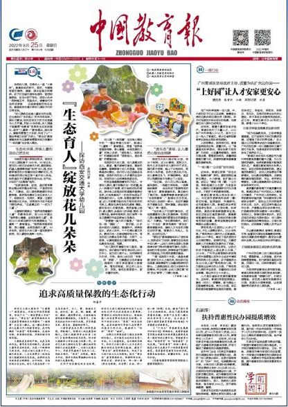 2022年9月25日《中国教育报》头版刊登我校何善平教授的评论文章《追求高质量保教的生态化行动》。文章对西安交通大学幼儿园以“一理念贯通三目标”为核心、“源生态”教育课程体系与五星教育管理体系为两翼的“一核两翼”生态育人模式进行了深入点评。文章认为这一模式坚持以幼儿发展为中心的教育理念,是对陈鹤琴“活教育”思想的继承、发扬和创新,具有理论价值、实践价值与创新价值。