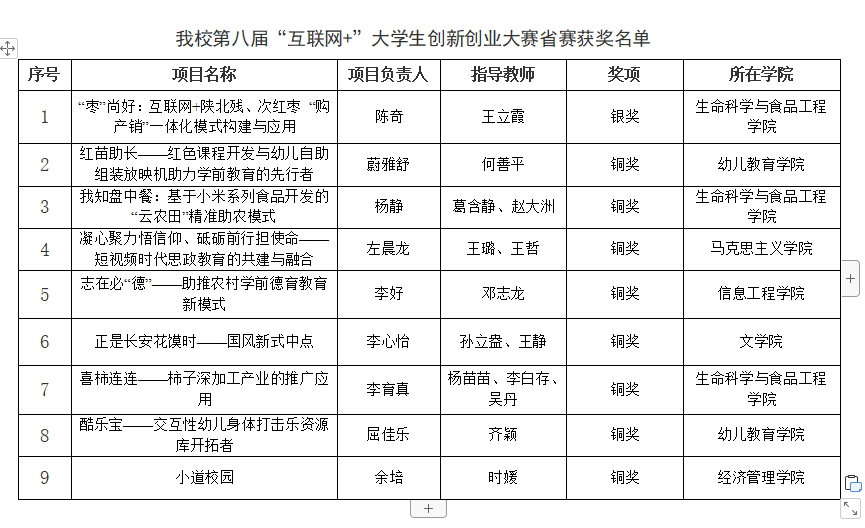 近日,陕西省第八届“互联网+”大学生创新创业大赛决赛在西安建筑科技大学落幕。在我校推荐的10个项目中,9个项目团队荣获省级奖励,包括银奖1项,铜奖8项,其中,生命科学与食品工程学院获奖3项、幼儿教育学院获奖2项、马克思主义学院、信息工程学院、文学院和经济管理学院各获奖1项,获奖总数再创新高。