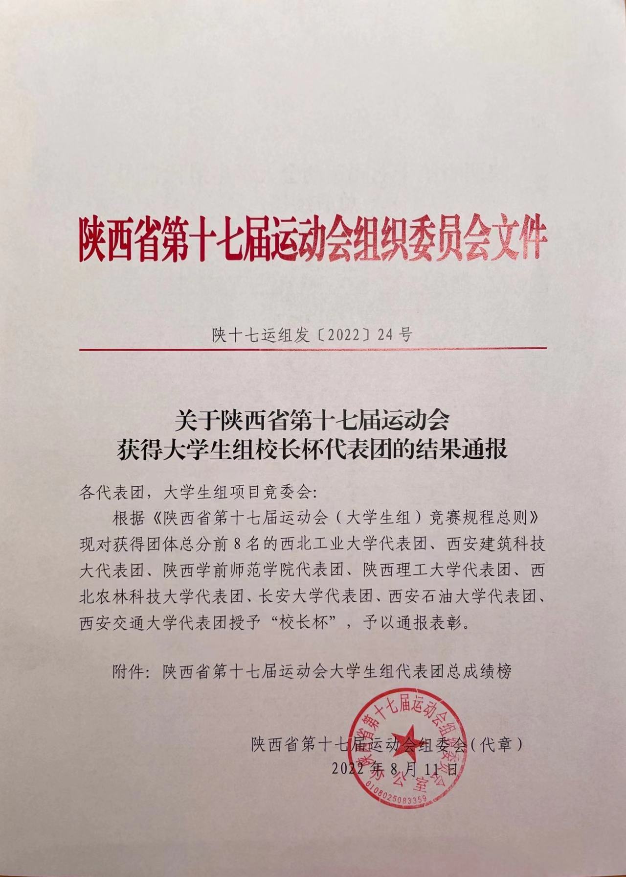 8月11日晚,陕西省第十七届运动会在榆林市体育中心圆满落下帷幕。本届运动会是陕西省参赛人数最多、办赛规模最大、项目设置最全的一届运动会,来自省内32所高校的1200名大学生参赛。陕西学前师范学院以团体总分168分的优异成绩排名陕西省大学生组第三名,荣获“校长杯”和“体育道德风尚奖”。