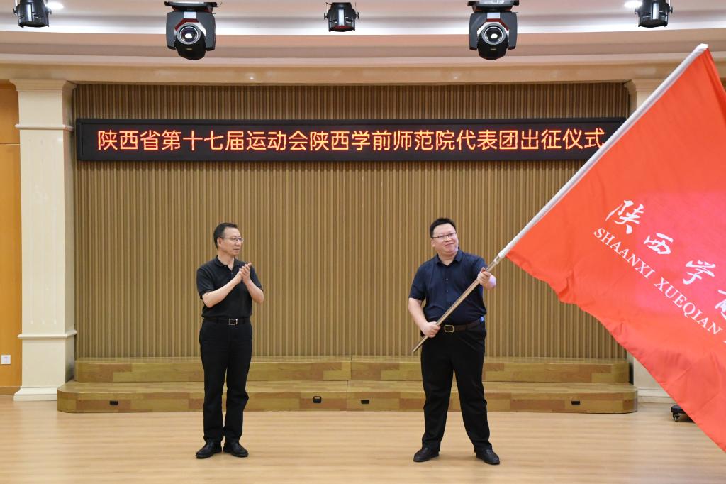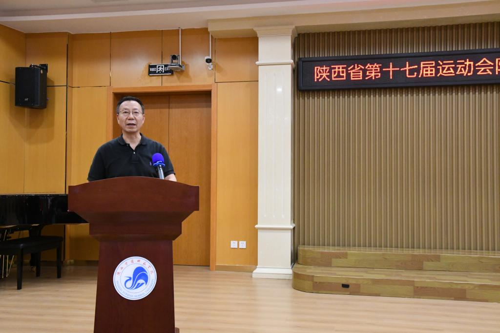 7月18日下午,陕西学前师范学院参加陕西省第十七届运动会代表团出征仪式在大学生艺术中心举行。校党委书记付建成,党政办、教务处、体育学院等单位领导以及各运动代表队领队、教练员和运动员参加了出征仪式。出征仪式由体育学院党委副书记(主持工作)王伟主持。
