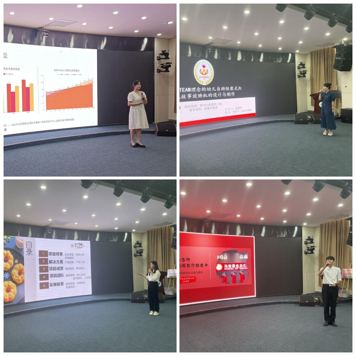 决赛现场采取“5+3”模式,即五分钟路演和三分钟答辩。路演环节各团队围绕项目背景、产品(服务)简介、市场分析、目标客户、商业模式、发展规划、管理团队及风险分析、社会效益等内容进行了全面系统的展示。答辩环节,团队成员各自分工合作,针对评委们提出的专业问题进行回答,评委们就选手路演中所凸显的优势及存在的问题进行了点评,从如何找准团队优势、深入市场调研、提高比赛演讲技巧、调整项目侧重点等方面,提出了专业性的指导。最终,“基于STEAM理念的幼儿自助组装式红色故事放映机的设计与制作”等6个项目荣获特等奖;“正是长安花馍时——基于劳动教育的高校 DIY 工坊”等8个项目荣获一等奖;“风采守艺人——乡村小手艺,创造大财富”等10个项目荣获二等奖。
