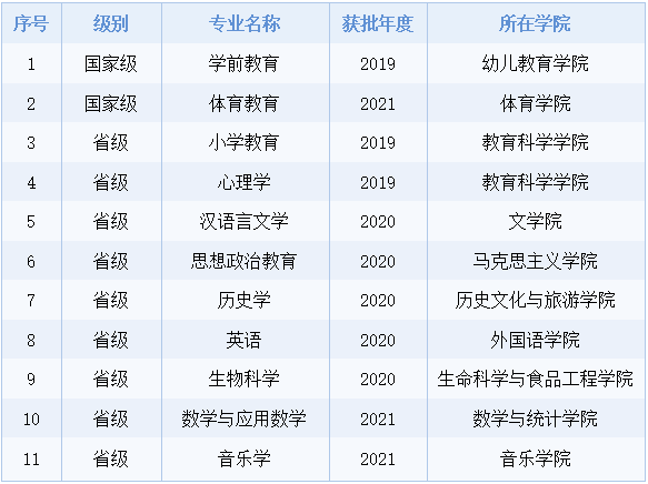 教育部自2019年启动为期三年的一流本科专业建设“双万计划”以来,我校共获批国家级、省级一流本科专业建设点11个,其中,国家级一流本科专业建设点2个,省级一流本科专业建设点9个,获批总数位居省属地方同类院校前列。国家级、省级一流专业建设点占本科招生专业总数的40.7%,彰显了我校在专业建设方面取得的显著成效。