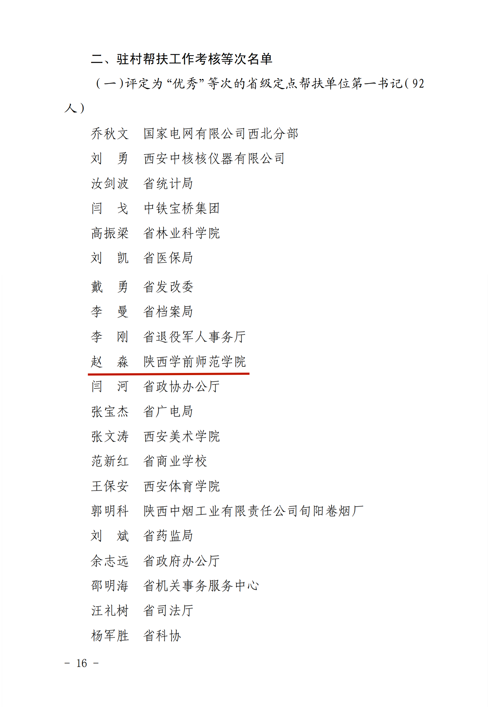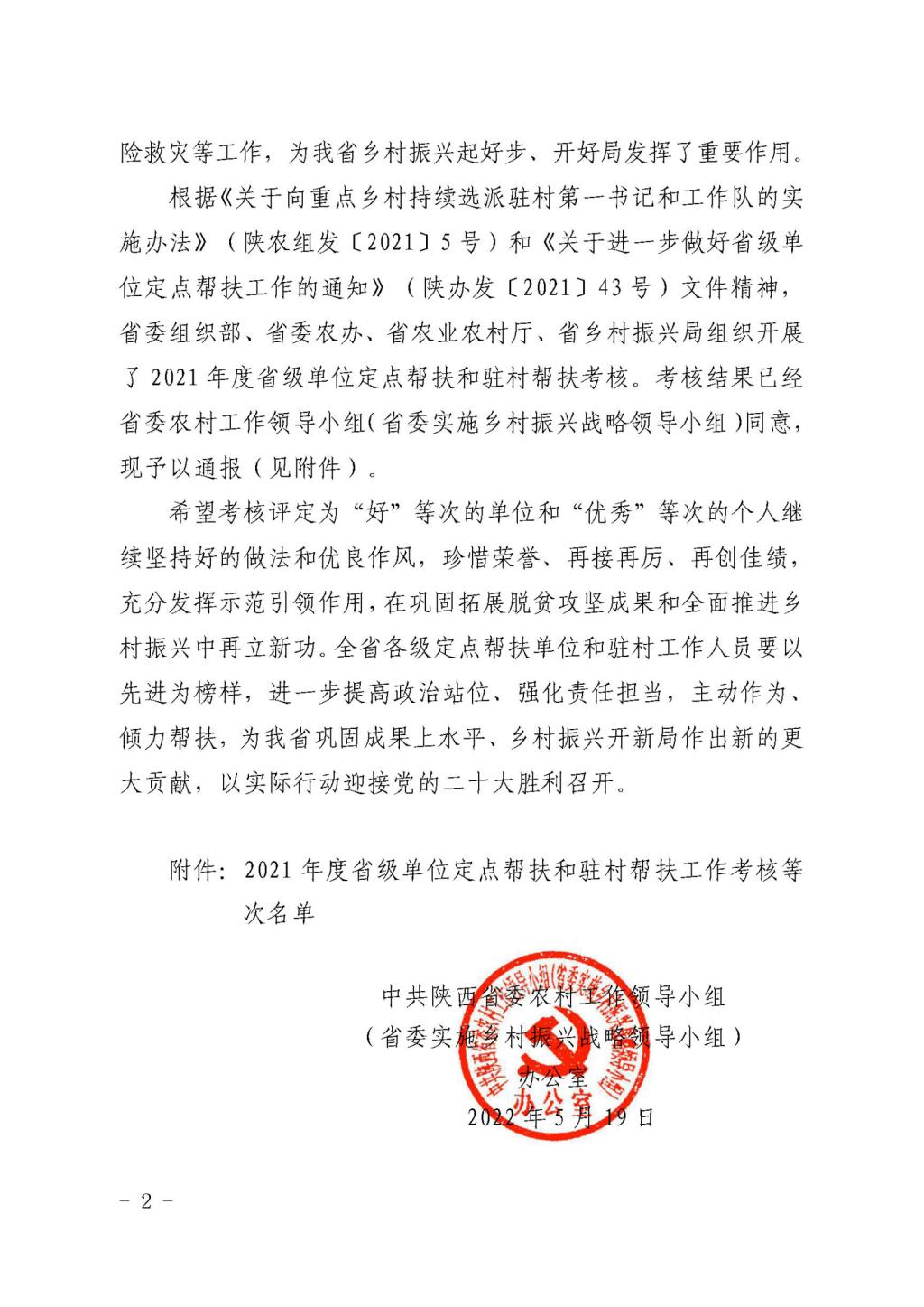 近日,中共陕西省委农村工作领导小组(省委实施乡村振兴战略领导小组)办公室印发《关于2021年度省级单位定点帮扶和驻村帮扶工作考核结果的通报》,公布由省委组织部、省委农办、省农业农村厅、省乡村振兴局组织开展的2021年度省级单位定点帮扶和驻村帮扶考核结果,我校2021年驻村帮扶干部、留坝县江口镇元树村第一书记、驻村工作队队长赵淼同志荣获驻村帮扶单位第一书记考核优秀等次,这也是留坝县省级帮扶团七个单位中唯一的第一书记优秀等次。