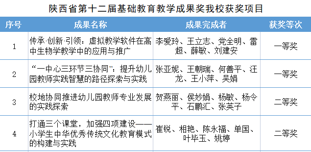 近日,陕西省教育厅、陕西省人力资源和社会保障厅公布了陕西省第十二届基础教育教学成果奖评审结果,我校教师主持完成的成果获奖4项,其中,一等奖2项,二等奖2项,我校教师参与完成教学成果特等奖1项,获奖总数在同类院校中居于前列。