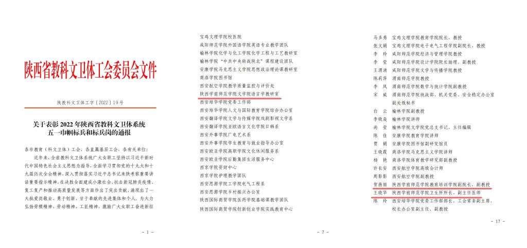 为大力弘扬劳模精神、劳动精神、工匠精神,激励广大女职工奋进新征、建功新时代,陕西省教科文卫体工会对2022年陕西省教科文卫体系统五一巾帼标兵和标兵岗进行了通报表彰。我校文学院语言学教研室荣获“陕西省教科文卫体系统五一巾帼标兵岗”荣誉称号,贺燕丽、王晓华2位同志荣获“陕西省教科文卫体系统五一巾帼标兵”荣誉称号。