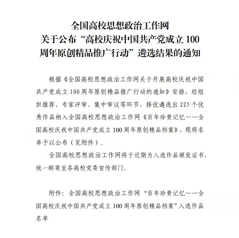 近日,全国高校思想政治工作网公布了“高校庆祝中国共产党成立100周年原创精品推广行动”遴选结果,本次评选经组织推荐、专家评审、集中审议等环节,全国共择优遴选出225个优秀作品入围。我校马克思主义学院党委推荐的《赓续红色血脉 让理想信念之光照耀华夏》入选《百年珍贵记忆——全国高校庆祝中国共产党成立100周年原创精品档案》,并在全国高校思想政治工作网进行全国巡展。