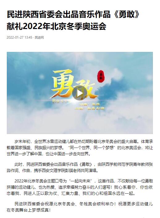 虎年将至,我们又将迎来一个龙腾虎跃之年!全世界冰雪运动健儿们翘首期盼的北京冬奥会将于2月4日隆重开幕,这是今年新春最好的礼物。为表达对冬奥会的期盼之情、对运动员的美好祝愿及对祖国的深情祝福,继年初主创歌曲《长安永安》,为西安战“疫”加油鼓劲受到广泛赞誉后,我校民进会员、音乐教师张淼又再次饱含激情作词、作曲,并携手西安文理学院彭琪老师创作了音乐作品《勇敢》。歌曲大气磅礴、昂扬奋进,诠释了“一起向未来”的赛会精神,一经推出就受到社会热烈反响,成为民进陕西省委向冬奥会力推的献礼歌曲,民进网、中国网、今日头条等网站及时予以跟进报道、推广,充分体现了张淼老师不凡的音乐造诣、旺盛的创作热情以及拥有的社会知名度和影响力,也为我校统战事业再立新功。
