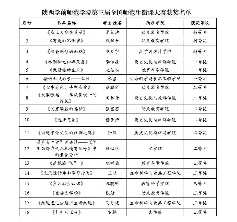 1月26日,由教育部陕西师范大学基础教育课程研究中心和西部师范大学教师教育创新与发展联盟联合主办的第三届全国师范生微课大赛决赛评审结果正式公布。我校选送20项作品中18项获奖,其中特等奖3项、一等奖3项、二等奖6项、三等奖6项,获奖率高达90%。幼儿教育学院张岚、刘洁和数学与统计学院权利娜3位教师荣获优秀指导教师,我校再次荣获“优秀组织院校”称号。