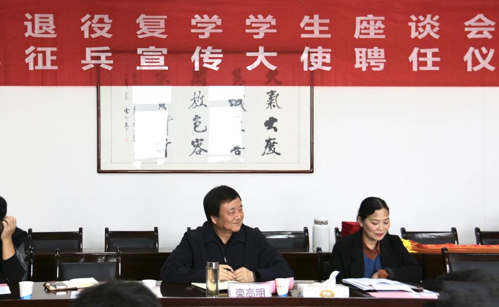座谈会结束后,栾高明为退役复学学生佩戴征兵宣传大使绶带并颁发聘书及纪念品。