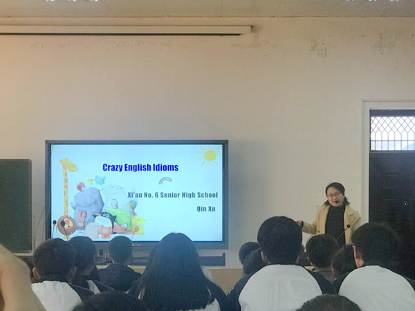活动的第一个环节是由来自西安市第六中学的秦旭老师给高三学生带来的示范课。她授课的课题是English Idioms。课程经历了歌曲导入、习语分类讲解、创设语境操练、小组活动展示等环节。秦老师教学经验丰富、教学方法灵活多样,师生互动强、学生参与热情高。课程设计从知识到能力、从认知到应用,由易到难,循序渐进,体现了以学生为中心,产出导向的教学理念。