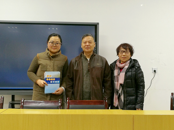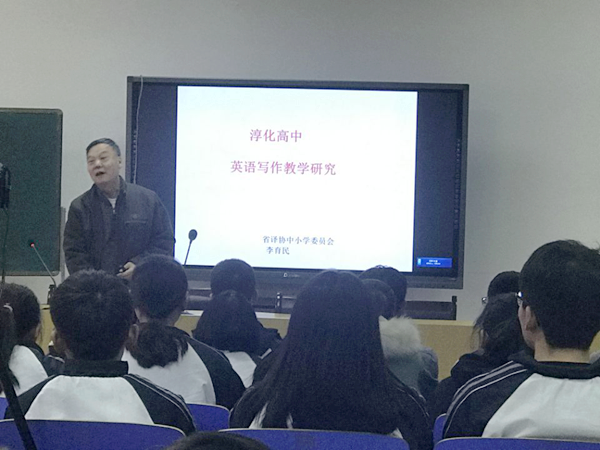 活动的第三个环节是由“全国优秀外语教师”、中国翻译协会“资深翻译家”李育民老师带来的讲座“英语写作教学研究”。李老师首先阐述了英语写作教学的现状和存在的问题,并分析了原因,最后他着重讲述了改进写作的有效策略。李老师以他50多年的从教经验以及他对当今写作教学中存在问题的深入了解、深刻思考和实战经验,从如何扩大词汇量、如何由词组句、由句连段、由段构篇进行了详细讲解,为当地师生和同去的老师、学生就如何进行写作教学提供了有效的方法、专业指导和全新的视角。值得一提的是李育民老师还把他新近出版的《最新中学英语读写突破》一套书籍,亲手赠送给淳化中学英语教研组,以帮助他们促进教学。这充分展现了一位老教育家热爱教学、关注基层、大力支持基础教育事业的责任和担当。