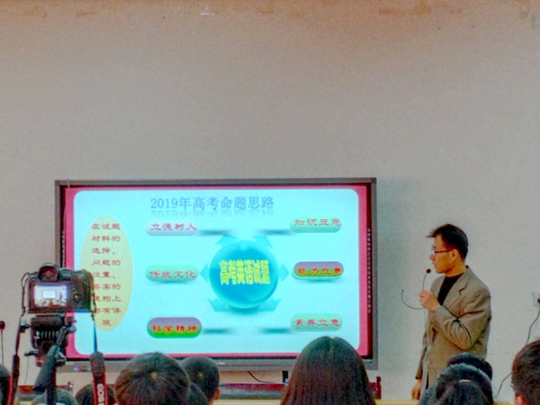 活动的第二个环节是由全国高中英语教师课堂教学大赛一等奖获得者、“省级优课”名师张锁成老师带来的“基于核心素养的高考英语备考策略”的讲座。张老师从《普通高中英语课程标准》(2017年版)课程总目标、英语学科四大核心素养、2019年高考命题思路、新高考的评价体系和关注点以及如何备考2020年高考四个方面展开。他首先分析了2019年全国卷II与课标的关系,指出三大主题语境覆盖所有题型,从题材上看,着重考查学生的核心价值观、学科素养和育人功能。其次,通过对2019年高考试题考查内容的分析,他指出2020年高考将考查立足全面发展育人方向,加强德智体美劳全面考查,体现高考评价体系总体要求,重视学科素养和道德品质养成。同时,他还分析了阅读理解、完形填空、语法填空题及短文改错题和写作的命题思路,失分点归纳,简明扼要指出备考思路、备考着力点及备考建议。张老师的讲座体现了他对往年高考的细致分析、深入思考和对2020年即将来临的高考的科学把脉和大胆预测。